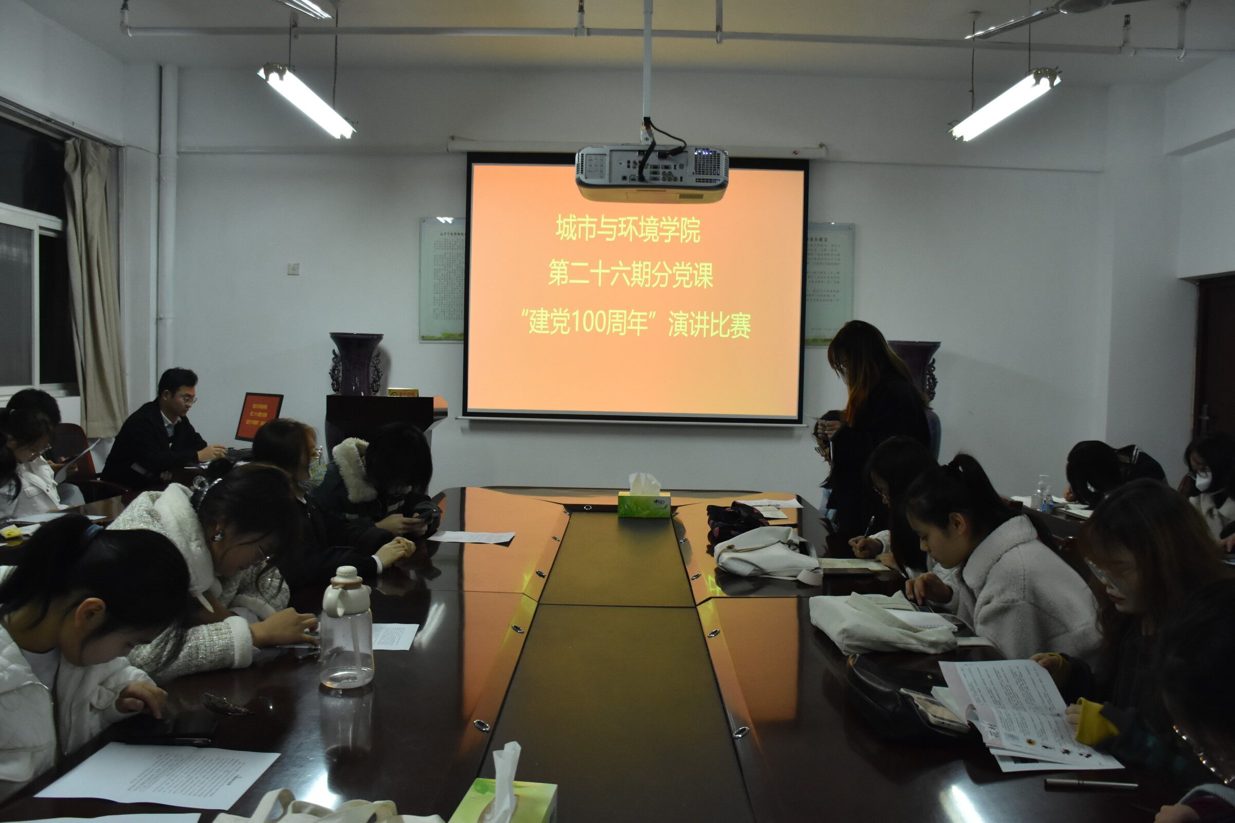 庆祝中国共产党建党100周年,回顾党的光辉历程,歌颂党的丰功伟业,11月11日晚,我院举办了庆祝“建党一百周年”演讲比赛,作为此次分党校培训的内容。本次会议由辅导员冯璐彤主持,第三十八期积极分子全体成员参加。