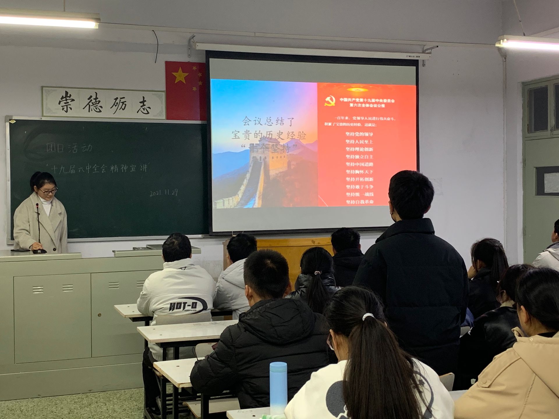 我院12名青马学员对接20、21级各团支部通过课前、团日活动等形式开展学习宣传贯彻党的十九届六中全会精神宣讲会。使每一位团员都能认真学习领会党的十九届六中全会精神,会中,青马学员与对接团支部的团员青年共同学习,交流学习感悟,切实将思想和行动统一到全会精神上来。作为青马工程培训班的学员以及新时代下的新青年,我们认真学习贯彻党的十九届六中全会精神,勿忘昨天的苦难光辉,无愧于今天的使命担当,不负明天的伟大理想,以史为鉴,开创未来,把学习贯彻党的十九届六中全会精神与深入学习贯彻习近平新时代中国特色社会主义思想结合起来,坚持党的全面领导,思想紧跟党走。