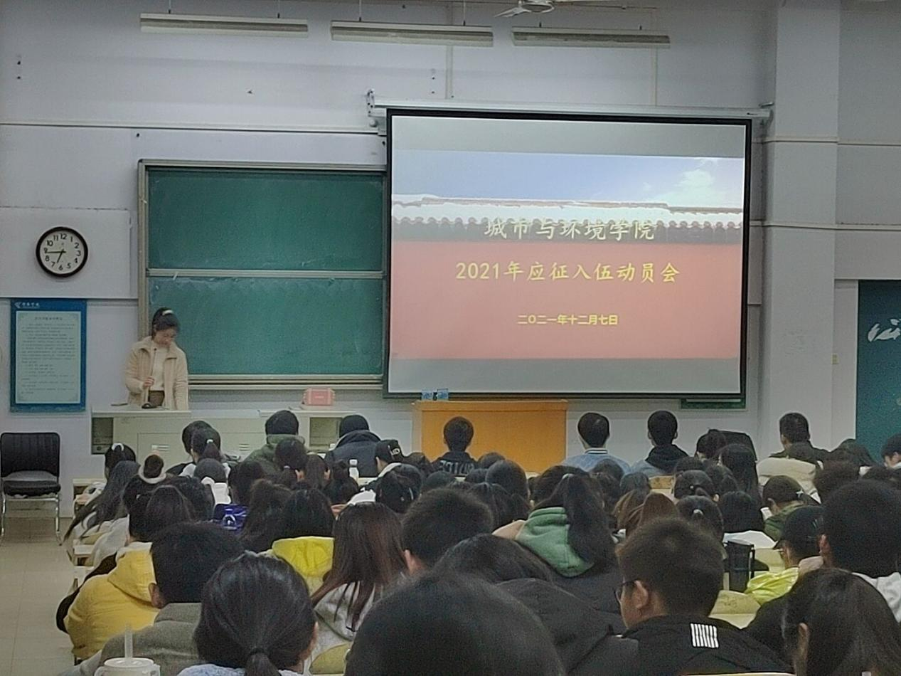 为鼓励我院学生积极参与应征入伍,提高兵员质量,推动国防和军队现代化建设,2021年12月7日,城市与环境学院开展了2021级大学生应征入伍宣传工作。辅导员张鑫和2021级学生一起,在B合5开展了2021年应征入伍动员会。