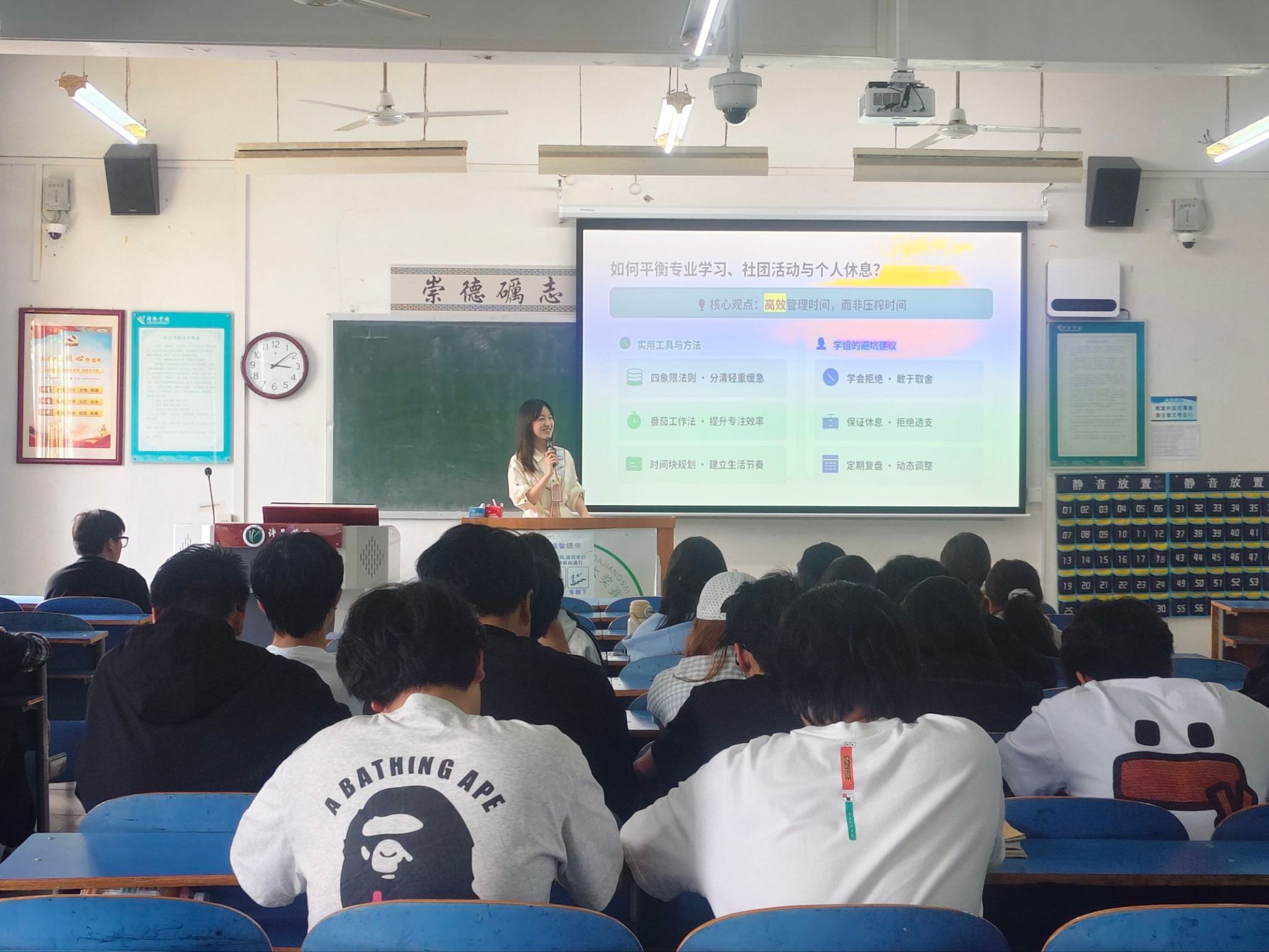 活动中,房妍汝学姐针对新生普遍存在的迷茫问题细致讲解。针对大一如何平衡学习与生活,她提出大一应以探索自我、夯实基础为主,既要保持努力态度,也要学会劳逸结合。同时分享了四象限法则等高效时间管理方法,指导新生科学分配学习、社团与休息时间,养成自律、有序的生活学习习惯。