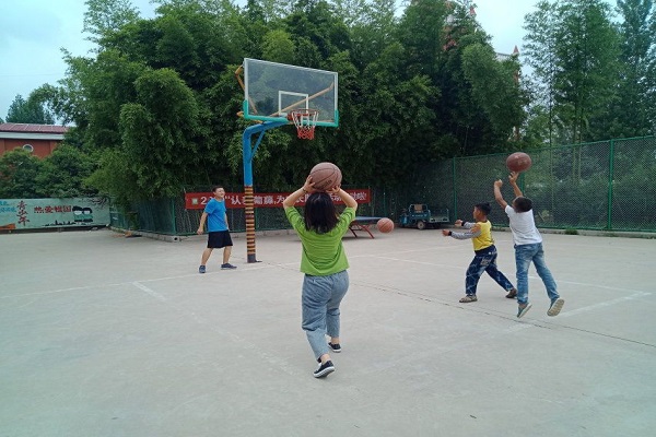 上午十点,是孩子们的自由活动时间,孩子们请志愿者们教他们打篮球。在活动场地上,孩子们灿烂的笑容明媚了整个球场。在正式开始打篮球之前,志愿者们一边指导着孩子们做准备工作,一边提醒孩子们打篮球时的注意事项。“身体朝篮筐方向,重心落在两脚之间,双膝微曲,身体稍往前倾,右手肘抬起并指向前方……”。志愿者们一个个手把手地教孩子们如何运球、投篮、防守等动作。在此期间,志愿者们告诉了孩子们运动的诸多益处,吸引了孩子们对运动产生了浓厚地兴趣,孩子们都纷纷表示以后一定会多多运动,健康成长。