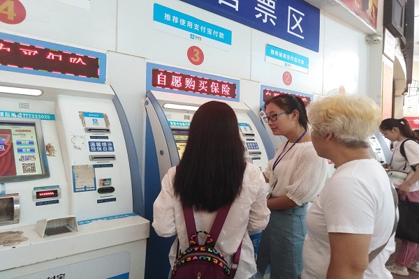 到达汽车站后,队员们便各自投入到不同的“战场”中去。看他们一个个“正气凛然”的样子,相信任谁看了都会不由得对他们生出一股信任。在自助售票机处,一位女士由于不知道如何用售票机买票而面露难色,这个时候志愿者们自然要“闪亮登场”。我们的一位队员走到这位女士身边,用像风一样轻柔的话语询问这位女士遇到了什么问题。了解情况后,队员赶忙开始帮这位女士买票,买票的同时耐心为这位女士讲解用自助售票机购票的具体操作,以便这位旅客下次能及时购票。这位女士取票成功后对这位志愿者表达了她真切地谢意。也许是我们社会实践队员所给予的真诚的帮助,又也许是这位队员温柔的绵绵细语,或是这两者的共同作用,共同交织出了这个夏日里的动人乐章。
