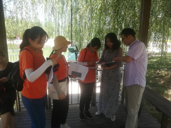 7月7日,许昌水系调研队迎来了暑期社会实践的第七天。今天虽然是个艳阳天,但有微风吹来,给这个炎热的天气带来一丝凉爽,让成员们的心情也变得愉悦。今天是外业组成员们进行第二阶段测量的第一天,早上八点,成员们乘车来到中央公园进行今天的测量记录。