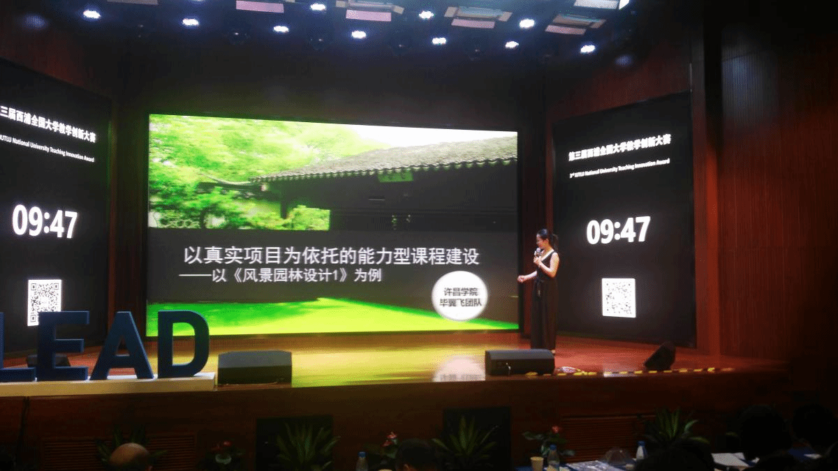 毕翼飞老师代表课程组,从课程背景、课程设计、课程实施、课程评价、课程效果五个方面对我校实施课程改革的《风景园林设计1》进行了全面的介绍。课程设计逻辑清晰,创新点突出。真正实现了课程顶层设计构架理论坚实,课程环节循序渐进,层次分明,改革效果突出,可借鉴及推广性强,最终我校毕翼飞课程团队荣获“西浦全国大学教学创新大赛“三等奖”的优异成绩。