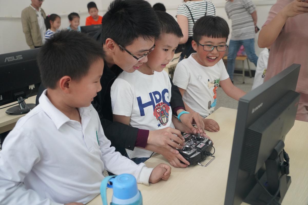 在无人机仿真飞行室,小学生们在谢康旭同学的指导下,在仿真飞行器中进行了无人机模拟飞行。学生们手持遥控器,紧盯屏幕中的四轴无人机,练习得十分认真。经过练习之后,同学们纷纷自告奋勇上台给大家演示训练成果。模拟飞行体验让孩子们圆了“小飞手”的梦。活动最后为分组动手制作模型小飞机环节,分两队进行飞行比赛,9名获胜者获得了自制的模型小飞机。比赛中,小学生热情高涨,活力四射,都希望自己可以获得此次奖品。