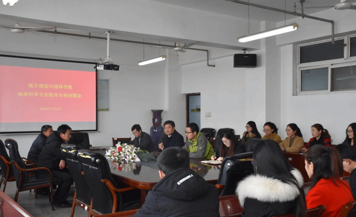 3月9日上午,我院在城规楼会议室举行2014级地理科学专场招聘会,出席此次招聘会的有平顶山鲁山县第一高级中学校长、闫志伟老师、城乡规划与园林学院院长吴国玺、副书记侯刚、地理科学系主任徐永新、韩冰雪老师以及我院14级地理科学专业的学生。
