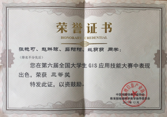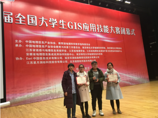 2017年12月8—10日,第六届全国大学生GIS技能大赛在南京举行,来自北京大学、武汉大学、南京师范大学、华东师范大学、首都师范大学、西南大学以及我校等97所高等院校100支学生代表队参加了GIS技能大赛,我校代表队由城乡规划与园林学院学院地理信息系教师李京忠、王轩老师带队,学生张艳可、赵琳琼、吕阳阳、姚萌萌四人组成,最终荣获全国大学生GIS大赛三等奖。