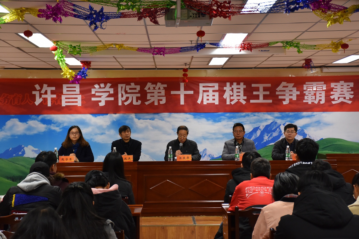 2017年12月9日上午九点整,由我校党委学生工作部、校团委主办,我院思奕棋社承办的“许昌学院第十届棋王争霸赛”在图书馆八楼隆重开幕。我校领导马廷杰、汪庆华、王中立、侯刚及赵学琴老师出席开幕仪式。