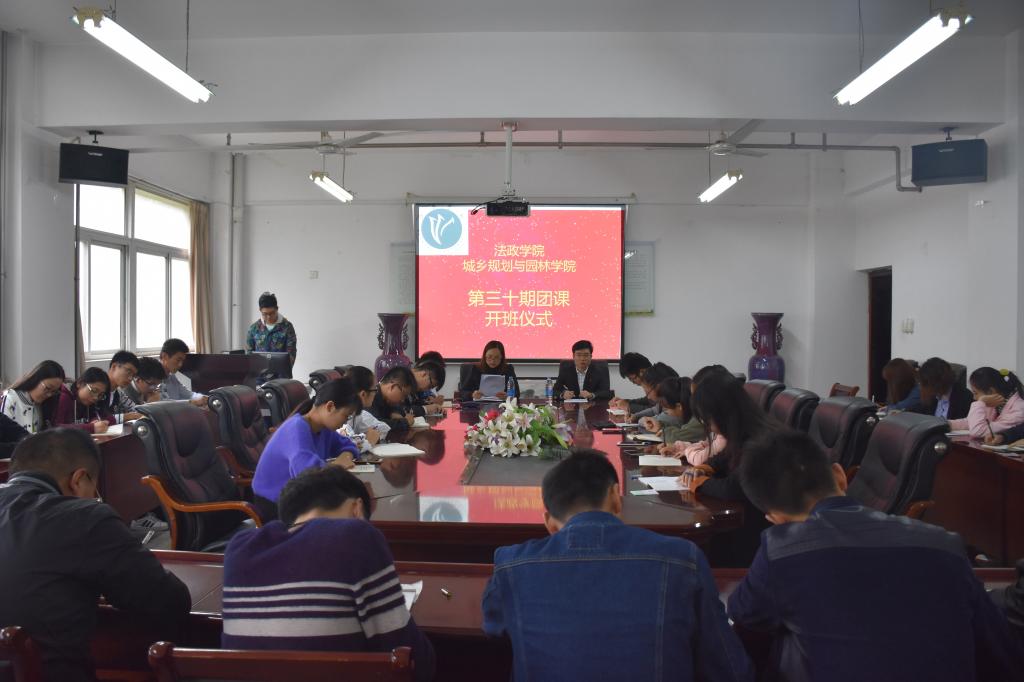 为进一步加强团员的政治思想观念,增强团员对团组织的深刻认识。2017年10月14日上午9点,我院和法政学院在城规楼二楼会议室联合举办“第三十期团课开班仪式”。法政学院团总支书记孙晨赫和我院团总支书记赵学琴以及全体团校成员参加了这次的开班仪式。