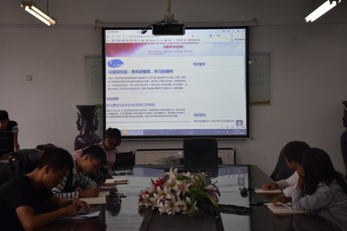 2017年9月30日上午团中央学校部、全国学联秘书处、中央党校机关党委、《学习时报》联合举行了“与信仰对话:青年的楷模,学习的榜样”全国大中学生《习近平的七年知青岁月》主题学习活动暨学习交流座谈会,我院组织学生观看了本次现场直播。