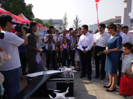 我院派出了由数十人从事无人机研发和应用研究的师生组成的科普团队,另有无人机数架,既有娱乐性质较强的四旋翼小型无人机,也有可用于测绘、农业管理的八旋翼中型无人机,除此以外,还印制了无人机技术及应用的传单、手册、展板等,来展台前参观的市民和中小学生络绎不绝。吴国玺教授及团队成员向前来参观的市民和学生耐心地介绍了无人机的系统组成和工作原理,并以城市规划和勘测设计为例,讲解了无人机在获取数据、规划设计和三维重建等方面的应用,吴教授强调道,技术为我们注入了新鲜的力量,它的发展前景一片光明。市民们既对师生们专业的知识和渊博的学问啧啧赞叹,也对这种新技术将会对社会引起的变革充满了期待。除此以外,科普小组也为小朋友们示范了如何操作无人机,看到趴在地上的无人机,告诉大哥哥大姐姐们,他长大以后立志也要成为一名飞行爱好者。参加的市领导也仔细认真地听取我院师生对近几年来工作的汇报,并现场做了指导,对于无人机在许昌市社会应经济发展中的应用前景给予了充分肯定,并鼓励我院师生,学好知识,为更好地服务社会贡献自己的力量。