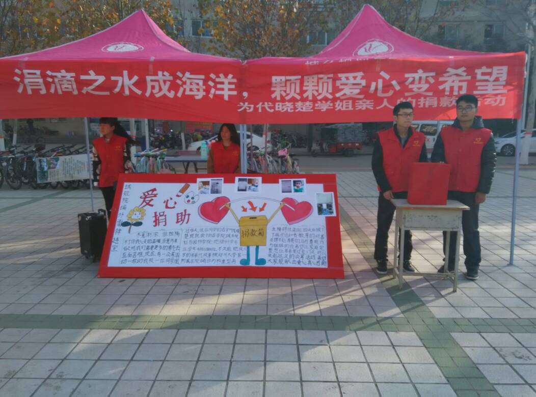 12月25日至26日,许昌学院城乡规划与园林学院编外雷锋连的全体人员在新老餐厅门口开展了为期两天的爱心募捐活动,此次活动旨在为我院大四学生代晓楚的家人筹集善款。