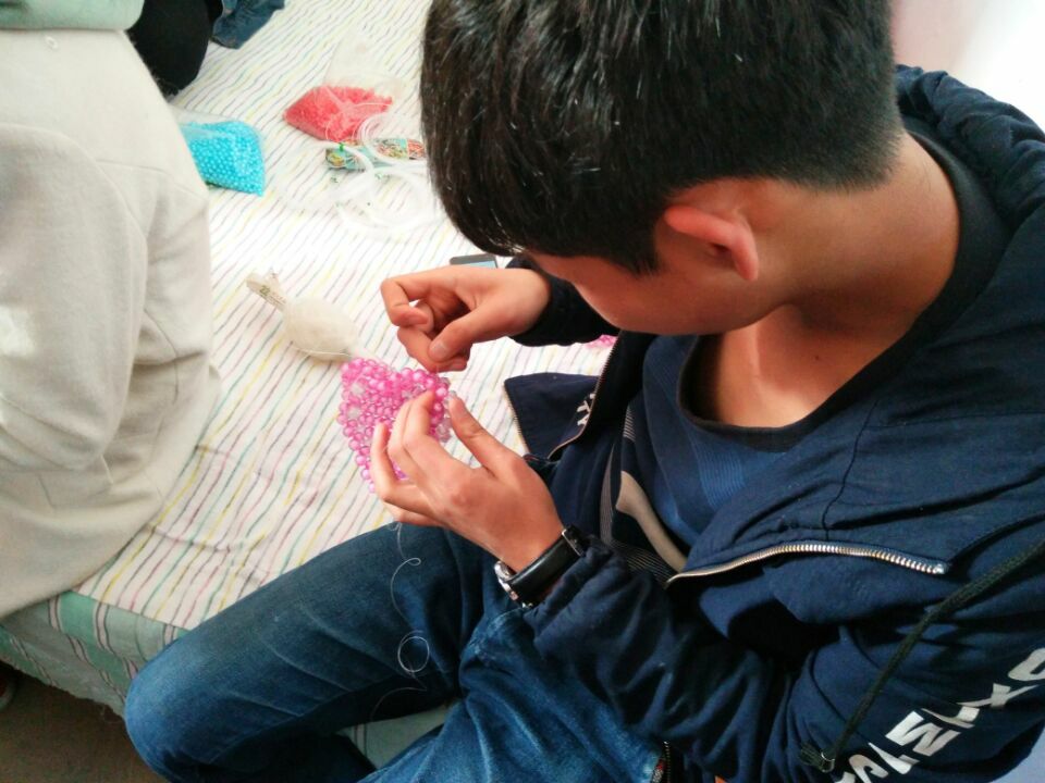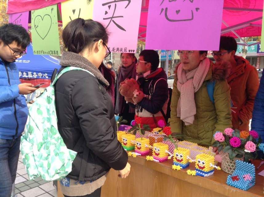 早上清理完道路之后,这些志愿者们的身影,又出现在许昌学院新餐厅门口前。这里正热闹举行着“爱心义卖,感恩有你”的感恩义卖活动。展台上漂亮的玫瑰、精致的笔筒等各色各样的小手工艺品都是由许昌以琳儿童救助之家的孩子们亲手编制,这吸引了众多同学驻足购买。有同学表示,在感恩节这个特殊的日子里能够以买一个笔筒的形式,去奉献一份爱心,感觉很开心。会长姜博表示,这次义卖活动很成功,筹集的所有资金,都将全部用以购买围巾,让孩子们快乐地度过这个寒冬。