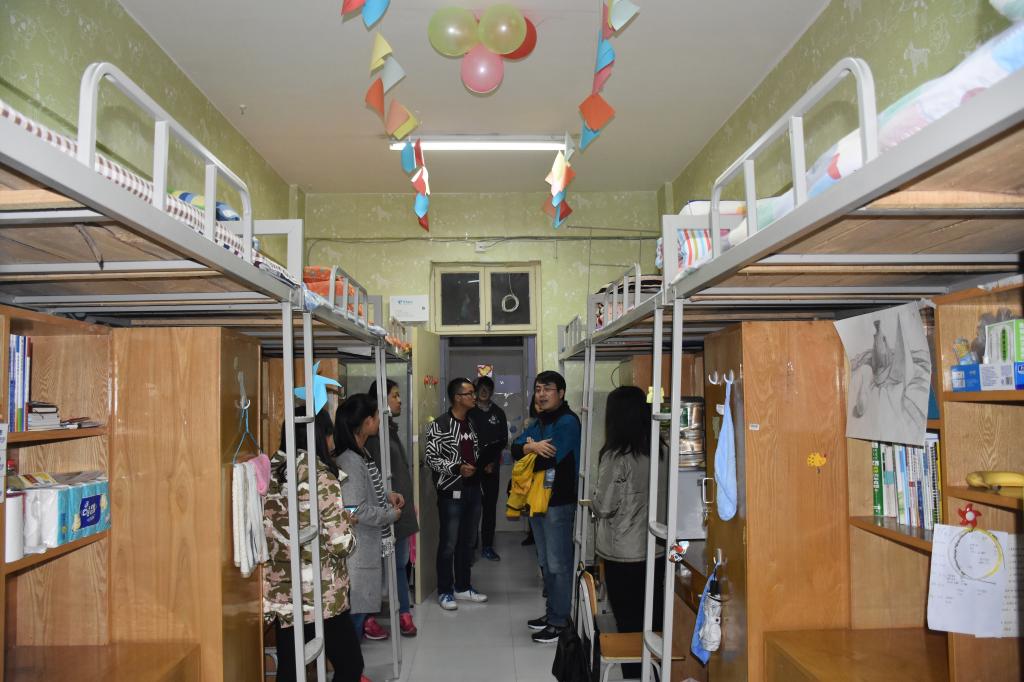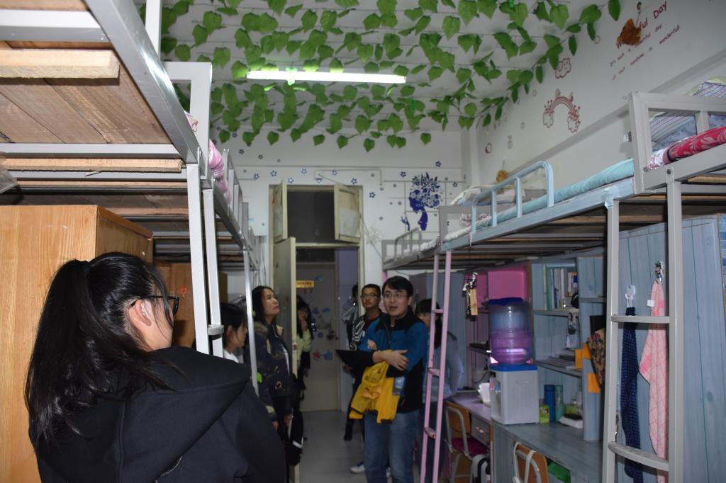 在为期一周的时间里,每一个大一新生都在繁忙之中抽出时间为此次活动做准备,每一个宿舍都别具一格。在卫生部同学的带领下,杨俊鹏老师来到我院大一的女生宿舍。杨俊鹏老师对每个宿舍的创意装扮表示肯定并给予鼓励。从宿舍的墙壁到柜子,各种各样的壁纸,从阳台到床的边缘,各式各样的装饰品都让老师赞不绝口。同时也希望同学们在这美丽、温馨的环境下认真备考。卫生部的同学也仔细地检查了宿舍的卫生以及大功率电器的情况。辅导员也特别强调了宿舍的用电安全,不要使用大功率电器。与此同时,袁菁唯老师也观看了男生宿舍的宿舍文化装扮情况。