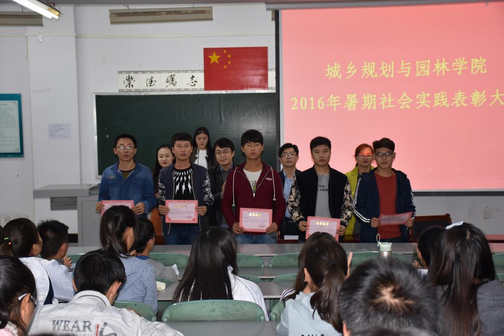 为了向新生宣传社会实践的意义和重要性,树立学生榜样作用,激励新生的学习热情。2016年10月21晚上7点,城乡规划与园林学院2016年度暑期社会实践表彰大会在C合二教室拉开帷幕。参与本次大会的有城乡规划与园林学院党总支副书记侯刚、团总支书记赵学琴、15级辅导员袁菁唯、16级辅导员杨俊鹏、获奖代表以及全体16级新生。本次表彰大会由宋艳若同学主持。