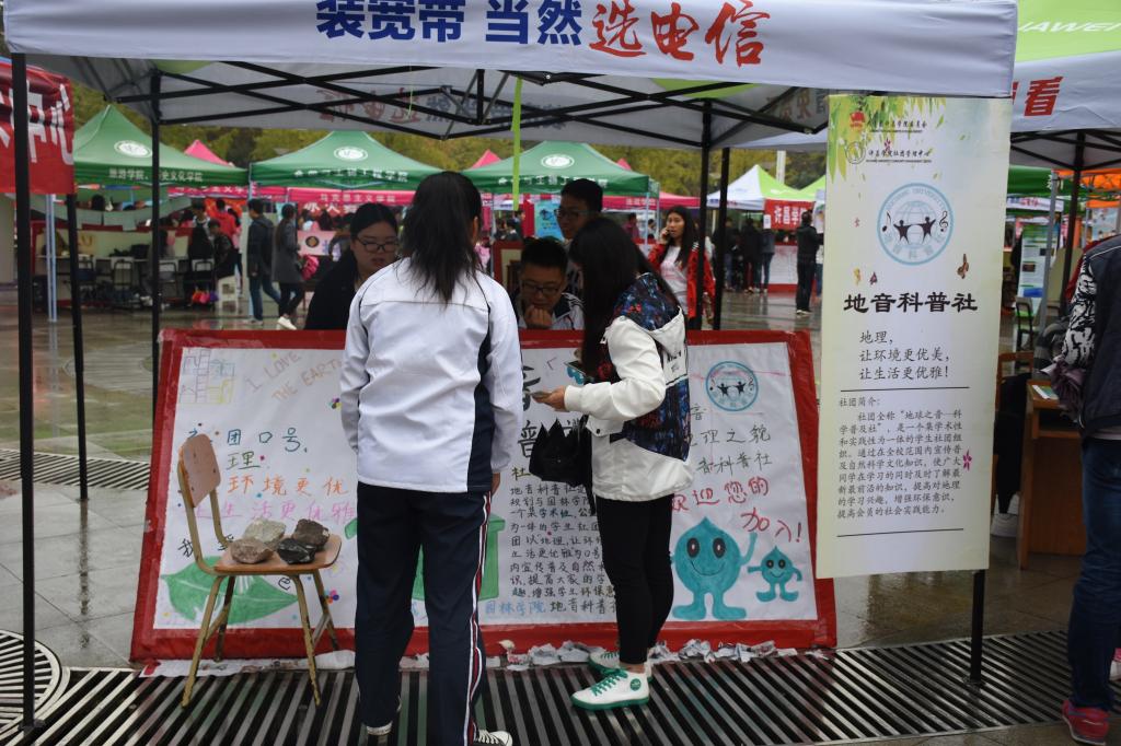 为吸引更多的学生加入到自己的社团中来,各社团在招新中可谓各出奇招,在招新现场处处可见醒目的宣传标语和新颖漂亮的宣传海报,还有一些社团将生动鲜活的图片挂在展板上吸引眼球,令人目不暇接,吸引无数同学前来咨询,报名。社团报名点的负责人态度诚恳,热情耐心地为新生答疑解惑,新生们悉心听取各社团的介绍并踊跃报名。思弈棋社现场棋艺对垒,经纬测绘社现场表演无人机飞行,GIS青年协会现场演说地理系统的有关知识,新青年协会用自己的专业知识让更多的人感受到园林艺术的魅力,地音科普社也将地理科学知识完美的呈现给大家。各社团招新火热进行中,一时形成了百花齐放,百家争鸣的盛况。