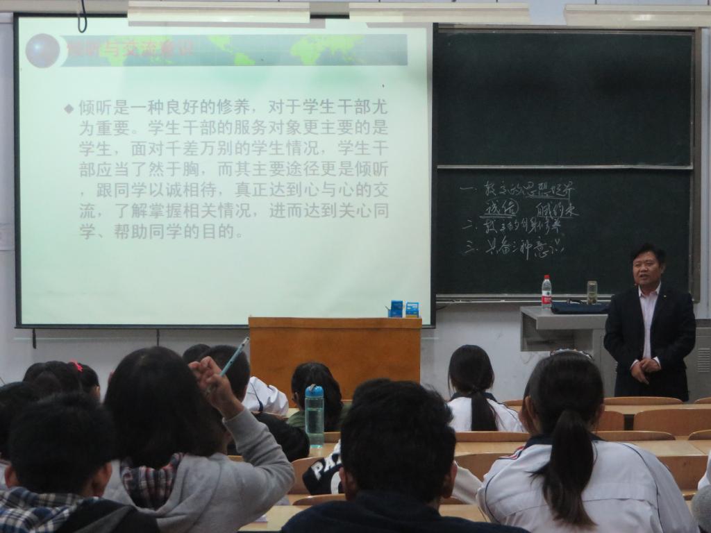 10月28日,我院院长吴国玺以“树立正确的价值观念,端正入党动机”为题。首先,吴院长从党的基本知识出发,沿着《中国共产党章程》的修订和党代会的发展,回顾党的发展历程,温故党的基本知识。随后,吴院长讲到,群众路线是党的生命线,只有坚持权为民,情为民所系,利为民所谋,党才能发展壮大,才能领导全国人民实现中国梦。“把申请写在党的旗帜上”,吴院长向大家讲到,每位同学要端正入党动机、加强党章学习与实践、以党员的标准严格要求自己,以自己的实际行动早日入党。