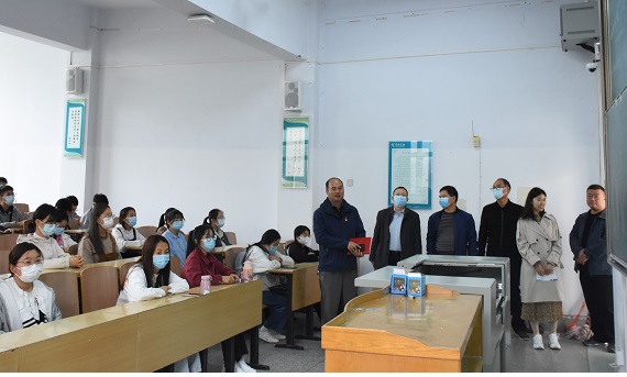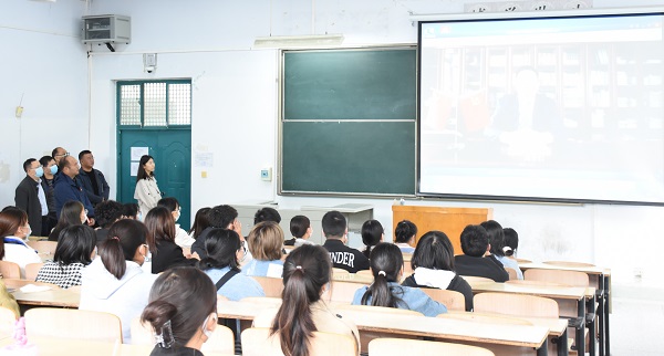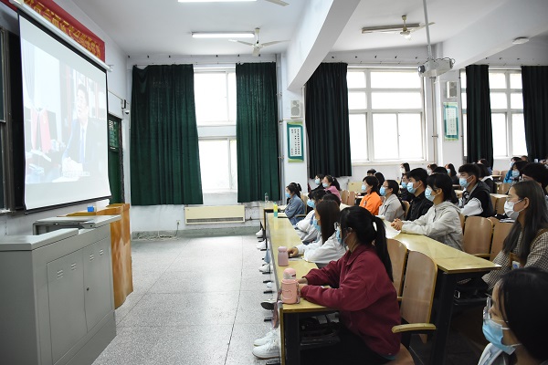 2021年10月11日城市与环境学院在B合十五与B合十六教室展开了全体新生的开学第一堂课,许昌学院党委书记闫纪建与许昌学院院长岳修峰为主讲。由于疫情防控需要,此次通过线上直播的形式为2021级的同学讲授思政“开学第一课”。我院领导班子以及21级辅导员张鑫老师在教室与新生们共同学习倾听。