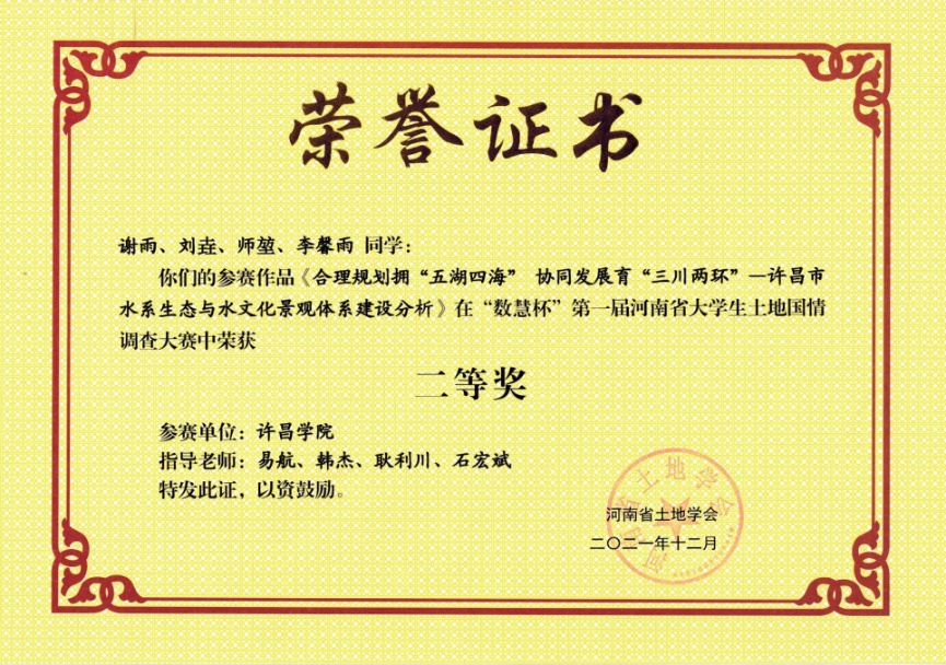 2021年12月11日,“数慧杯”第一届河南省大学生土地国情调查大赛决赛在河南理工大学举行,来自河南省的队伍经过初试选拔,最终选拔出来自不同高校的40支队伍进入决赛。我院代表许昌学院参赛,测绘工程专业学生杨慧勇、刘少卓、高春阳组成“土圭垚㙓队”,谢雨、师堃、刘垚、李馨雨组成“水韵莲城队”。两支队伍在易航等老师的指导下,从全省众多参赛队伍中脱颖而出进入决赛,并且荣获河南省二等奖。