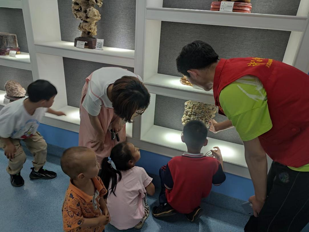 本次活动由地音科普社担任志愿者,在6月1日下午16:00集结完毕, 16:10南海街二年级的小朋友们在老师的带领下有序进入了地球科学馆的第一个展厅,随后,志愿者开始为小朋友们介绍宇宙的产生、地球地质年代的知识,其中提到恐龙所在的地质年代引起了小朋友的极大兴趣。接着,志愿者带领小朋友们参观了恐龙蛋化石、“五花肉”、岩浆岩、变质岩、沉积岩等各种各样的岩石。有的岩石经过精细的打磨呈现出落日的形状,成为此次开放日的团宠。在随后的自由参观时间,小朋友们三三两两聚在一起仔细观察陈列品,眼睛里透露出对知识的渴望。在此次地球科学馆开放期间,也有许多市民来到地球科学馆参观。