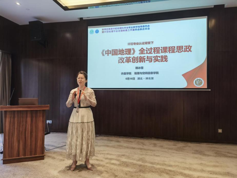 大会共设地理学专业建设、教材与课程建设、人才培养、野外联合实习、课程思政与教学改革、地理学类编辑面对面和地理学学科建设等七个分论坛。地理科学系副主任韩冰雪在“课程思政与教学改革”分论坛做了题为“师范专业认证背景下《中国地理》全过程课程思政的改革创新与实践”的主题报告,阐述了专业课程进行全要素思政改革的系统思考和实践成果,得到了与会专家的认可和肯定。