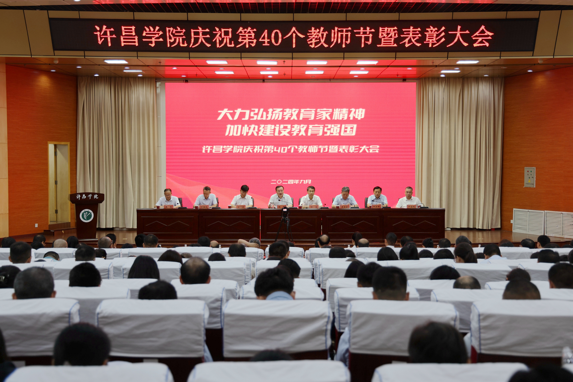 9月9日下午,我校在图书馆学术报告厅举行庆祝第40个教师节暨表彰大会。校党委书记郭涛,校长郑直,党委副书记、工会主席梁予昉,副校长高金星、杜根远,纪委书记申占伟,副校长王俊、牛海鹏出席大会。全体受表彰人员、中层领导代表、教职工代表、退休教师代表和学生代表参加大会。大会由郑直主持。