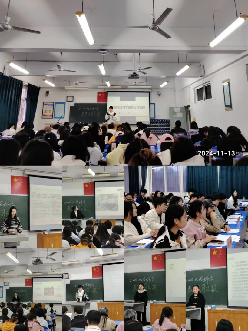 为了全面总结教育见习成果,11月13日,地理科学系精心组织了教育见习答辩。同学们以小组为单位,将见习期间的所见所闻、所思所悟进行了系统的梳理和总结,并制作了精美的汇报材料在答辩现场进行展示。有的小组深入剖析了不同教学风格对学生学习效果的影响,提出了个性化教学的重要性;有的小组则聚焦于课堂突发情况的应对策略,通过实际案例分享了自己的独到见解;还有的小组对地理学科核心素养在教学中的渗透进行了深入探讨,展现了他们对教育教学理念的深刻理解。在答辩过程中,同学们思维敏捷、条理清晰,不仅充分阐述了自己的观点,还虚心接受了评委老师的提问与建议,展现出了良好的专业素养和积极向上的精神风貌。