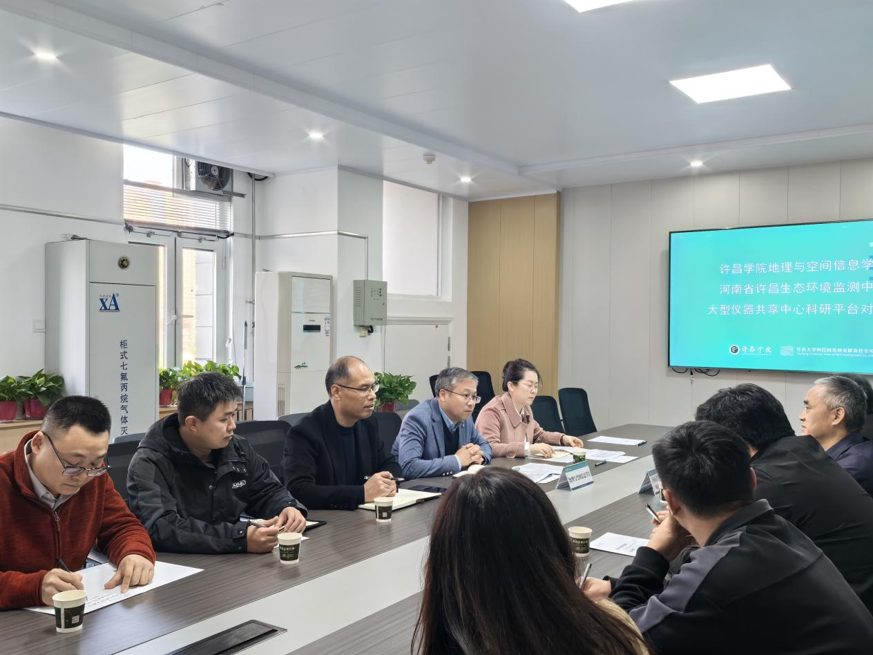 11月20日下午,由许昌学院大型仪器共享中心牵头,我院与河南省许昌生态环境监测中心在大学科技园406会议室举行科研平台对接会。河南省许昌生态环境检测中心主任郭长虹、副主任张培锋,院长闫慧、副院长郑敬刚、地理科学系主任韩冰雪、杨渭林博士与李洪彬博士参加会议。会议由大学科技园总经理王豪主持。