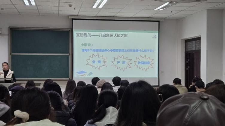 讲座以“破冰之旅”开篇,刘莹通过互动提问引导师范生用“负责”“幽默”“严格”等关键词描绘理想班主任形象,并深入探讨班主任作为“德育引领者”的挑战。在“智慧带班”环节,刘莹结合陶行知“四颗糖果”经典案例,倡导“倾听式教育”,并分享“课堂看小说”事件的处理艺术,引发师范生的深度思考。
