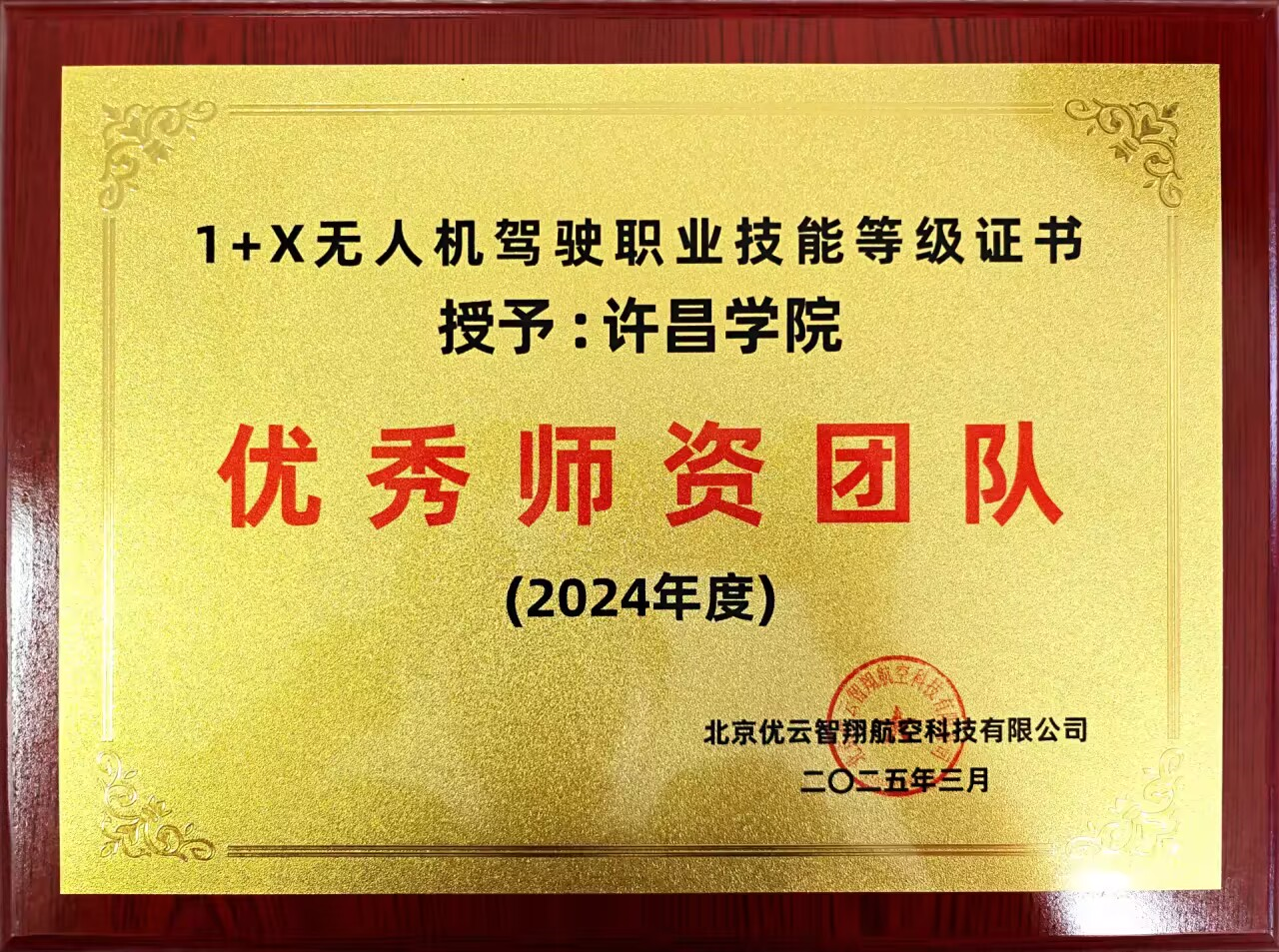 近期,教育部“1+X”无人机驾驶职业技能等级证书评价组织机构北京优云智翔航空科技有限公司授予我校2024年度优秀师资团队称号。