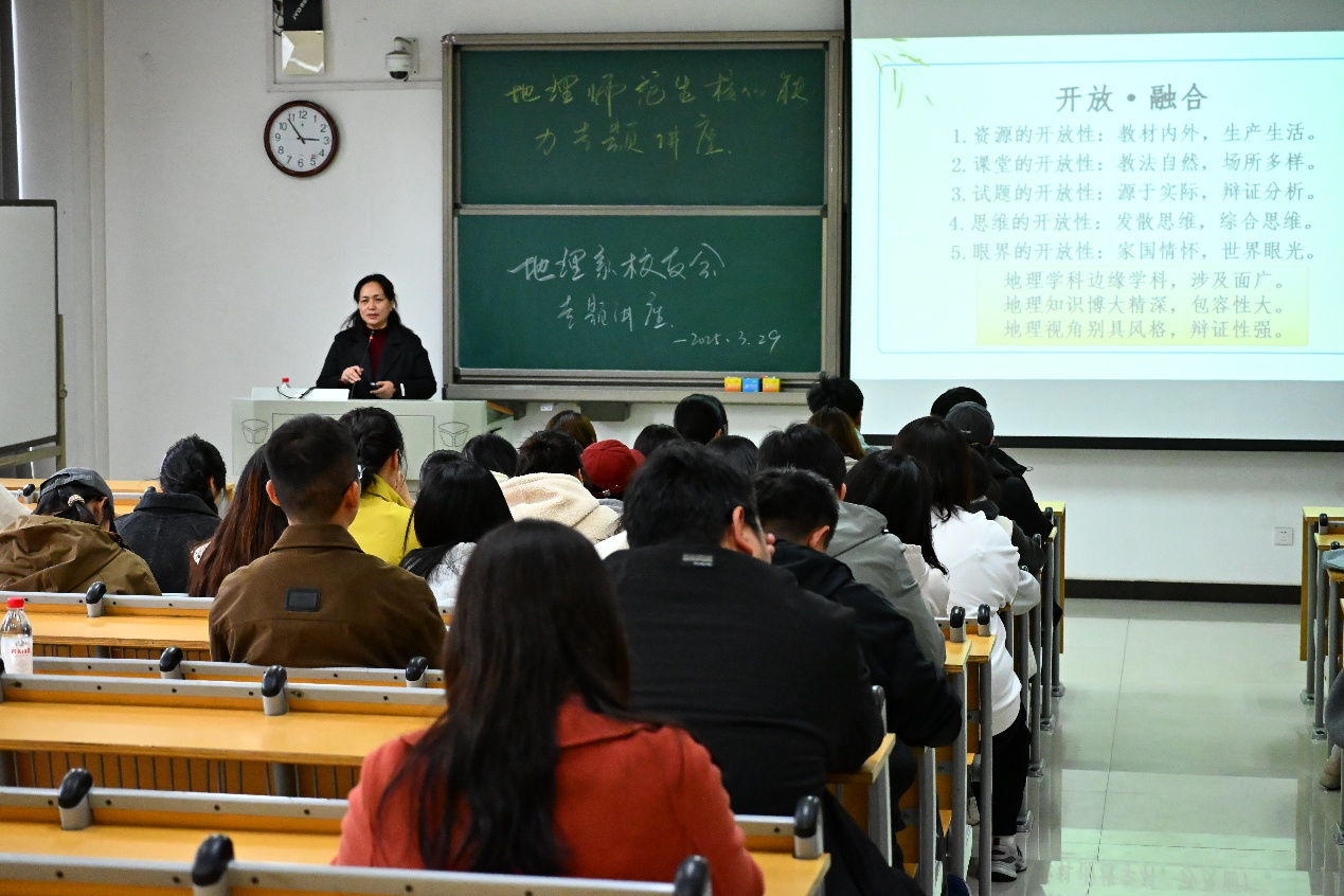 本次系列讲座以“新时代地理师范生核心能力培养”为主题,分为三个专题展开。首场讲座中,张云枝老师以“德育铸魂:构建班级管理新生态”为题,结合其29年的从教经验,阐述了以“生态化德育”理念引领班级文化建设的重要性。她特别强调:“地理教师不仅要掌握扎实的学科知识,更要具备将地理核心素养融入教学设计的能力。”