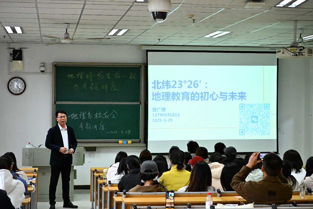 第三场讲座中,曾广博校长以“北纬23°26':地理教育的初心与未来”为题,将自己的职业发展轨迹与地理科学的发展变迁紧密结合,为在场学子勾勒出一幅充满希望的未来图景。他表达了自己的期许,告诉同学们需要通过脚踏实地的奋斗来勇敢地抓住每一次机遇,抓住自己光明的未来。