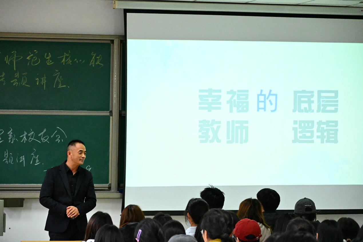 第二场讲座由张红远老师主讲,主题为“幸福教师的底层逻辑”。张老师以“过来人”的身份传授同学们自身幸福的奥秘:“拒绝多巴胺陷阱,拥抱内啡肽”,同时也教会了同学们如何接纳自己的工作,接纳自己的学生,从而幸福的生活。