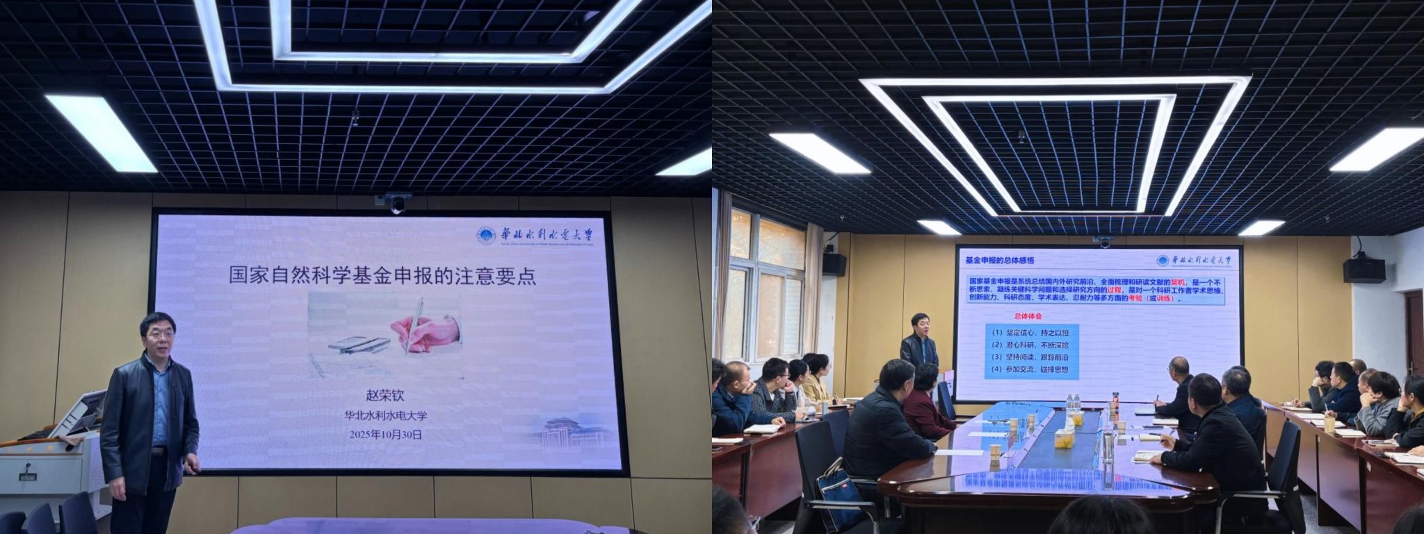 为统筹安排2026年度国家自然科学基金申报工作,切实提升申报质量,10月30日上午,我院在二楼会议室召开2026年度国家自然科学基金申报动员会,华北水利水电大学赵荣钦教授应邀作基金申报辅导报告。许昌学院副校长赵艳敏、科研处副处长杨飞出席会议。地理与空间信息学院党委书记樊明智、院长闫慧、副院长郑敬刚、李长坡及全体博士参会。会议由闫慧院长主持。