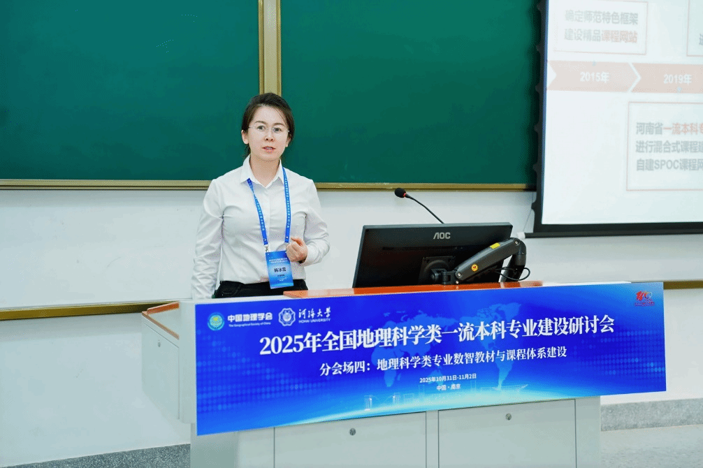 大会设立了六个平行分会场,涵盖专业建设新路径、实践教学重构、数智教材与课程体系等多个核心议题。在“地理科学类专业数智教材与课程体系建设”分论坛上,韩冰雪老师作了题为“中国地理课程思政的智慧改革与实践”的主题报告,展示了我院在课程思政与智慧教学深度融合方面的改革思路与实践,获得了与会同行的积极关注与认可。