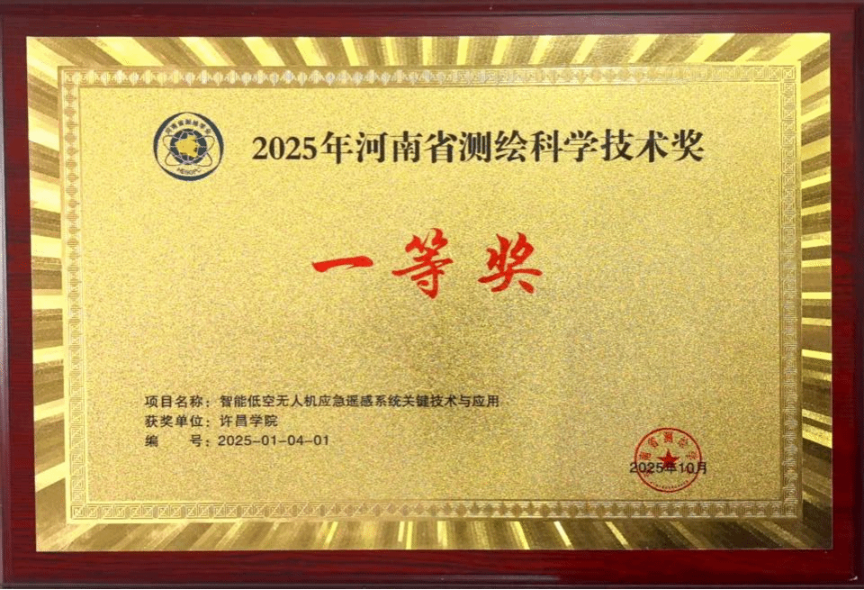 近日,河南省测绘学会公布2025年河南省测绘科学技术奖评选结果。由我院教师耿利川博士牵头,联合成都纵横大鹏无人机科技有限公司、河南省地质矿产勘查开发局测绘地理信息院等单位共同申报的“智能低空无人机应急遥感系统关键技术与应用”项目,荣获2025年河南省测绘科学技术奖一等奖。