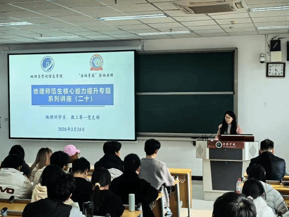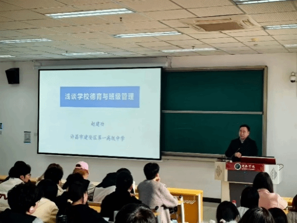3月24日下午,地理师范生核心能力提升专题系列讲座(二十)暨“杏坛菁英”党建系列活动在文科综合楼E-409开讲。本次讲座特邀许昌市建安区第一高级中学党委书记赵建功作题为《浅谈学校德育与班级管理》的专题报告。地理科学系韩冰雪、蒋亮和李洪彬老师及24级地理科学(师范)专业本科生共同聆听了讲座。