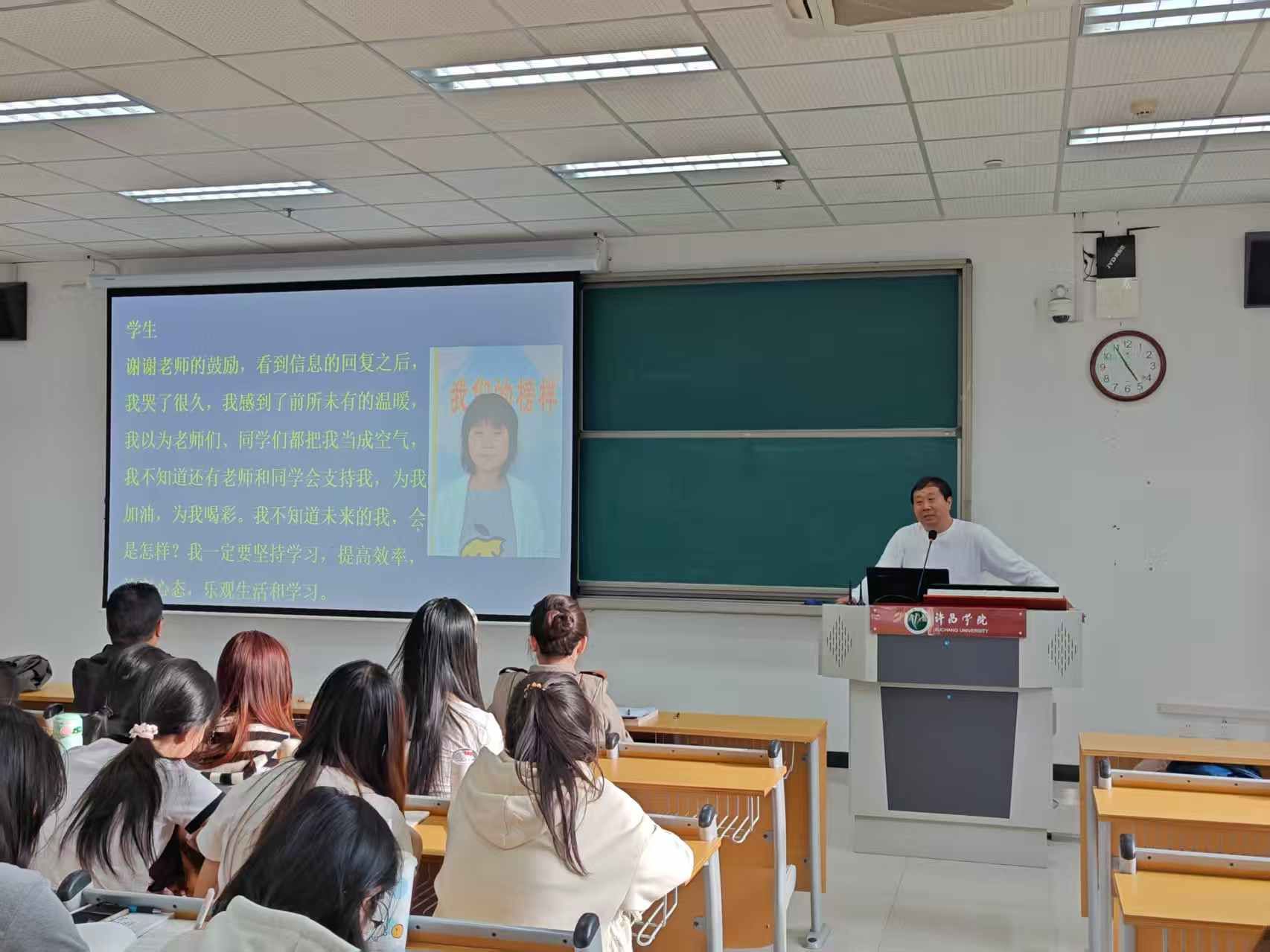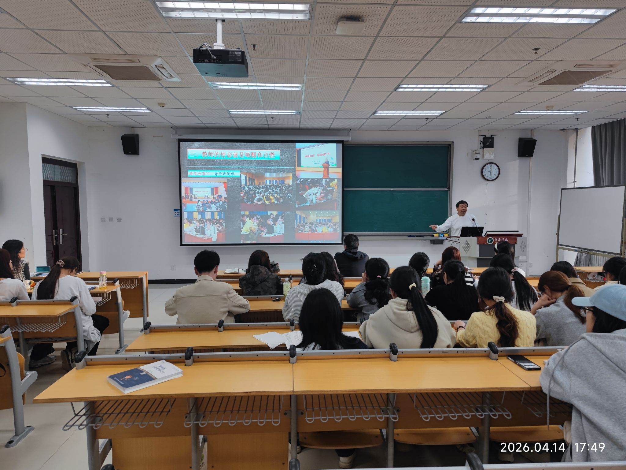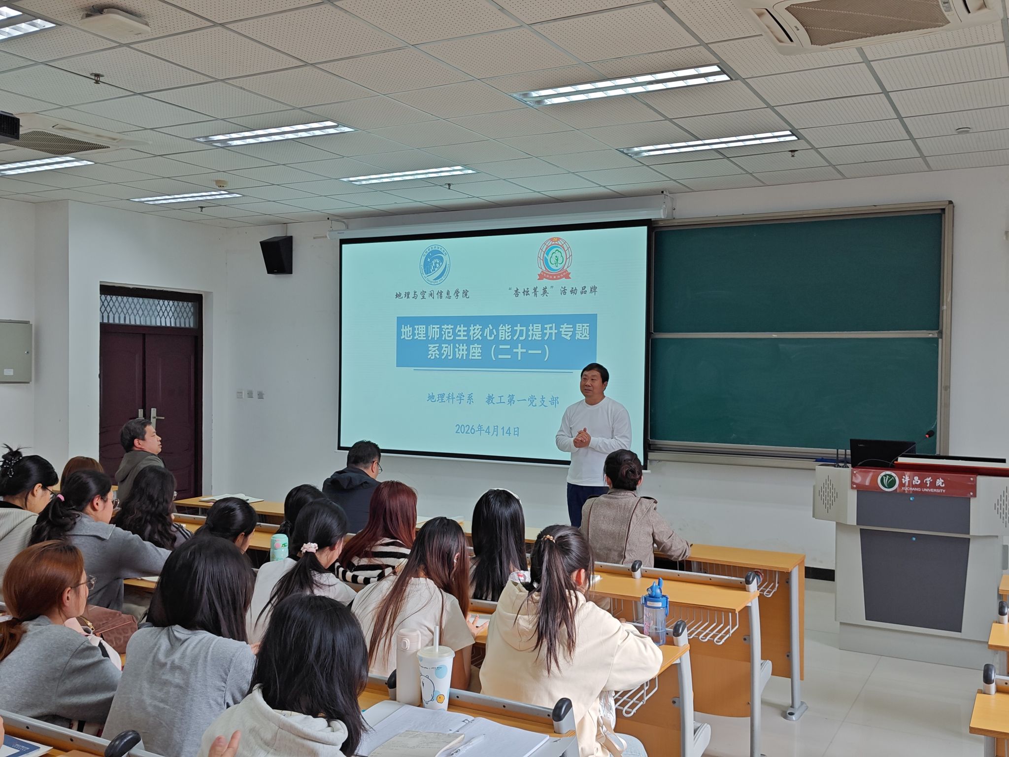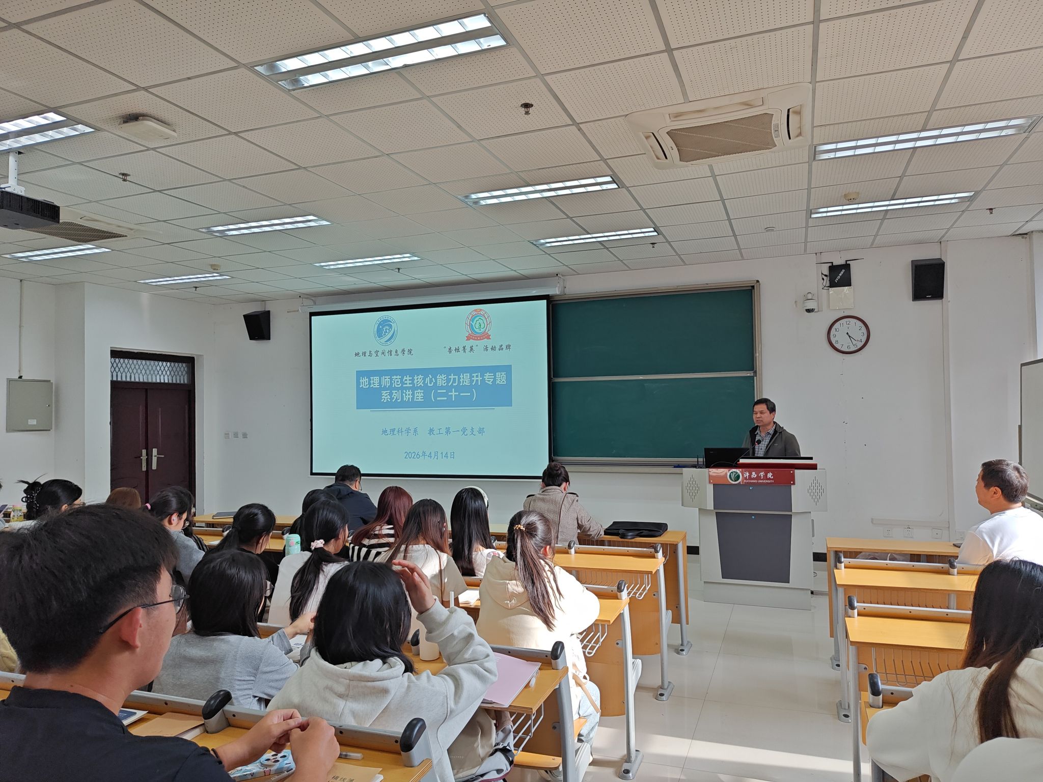 4月14日下午,地理师范生核心能力提升专题系列讲座(二十一)暨“杏坛菁英”党建系列活动在文科综合楼E-309举行。本次活动特邀优秀校友、周口市郸城县第三高级中学副校长于灏担任主讲,作题为《让教育情怀滋养学生的生命成长》的专题报告。许昌学院国有资产管理处处长刘军伟、地理与空间信息学院副院长李长坡、地理科学系主任韩冰雪、教师蒋亮及2024级地理科学(师范)专业本科生共同聆听了讲座。
