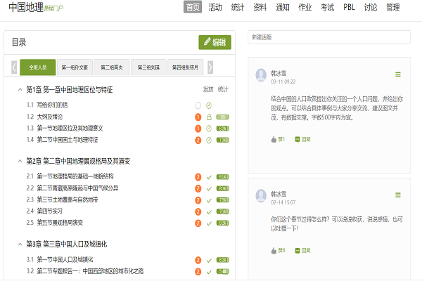 学生进行网络听课,经常会出现学习效率不高,流于形式等问题。故线上教学应该尽量资料丰沛,作业及时,题量和难度适当,这样学生有的放矢,逐步提高学习热情。中国地理课程在资料建设中借助学习通,上传了配套的视频,教案、ppt及电子书。学生的学习任务点过关率能达到90%以上。