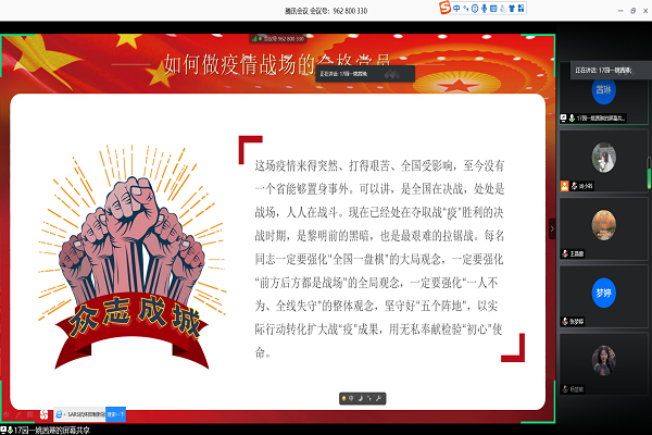 在本次党课培训中,以高晶、杨梅、王鑫等为代表的十位预备党员以线上形式发表了疫情期间,身为党员我们应该怎么做”、“时代有呼唤,青年有担当 ——疫情面前,青年奋勇向前”、“让永久奋斗成为最鲜亮的青春底色——青年应该怎么做”等为主题的微党课展示。其中,高晶向积极分子们讲解了什么是疫情,并以学生党员的角度向我们阐述应该“怎么做”的问题,她说,“困难当前,挑战仍在,但我坚信,各行各业的党员必将不忘初心、牢记使命,挺身而出、英勇奋斗,紧密团结在党中央周围,发挥专业优势与特长,带领全国人民打赢这场疫情防控阻击战。”杨梅则鼓舞我们要成为一个有担当的青年,勇担时代重担,并希望我们以疫情中涌现的袁伦、黄泽东、肖覃、宇晗为榜样,为祖国做出自己应有的贡献。