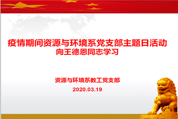 319日,资源与环境系教工党支部开展了线上主题党日活动,活动主题为“疫情期间资源与环境系党支部主题日活动--向王德恩同志学习”。全体教工党员参加。