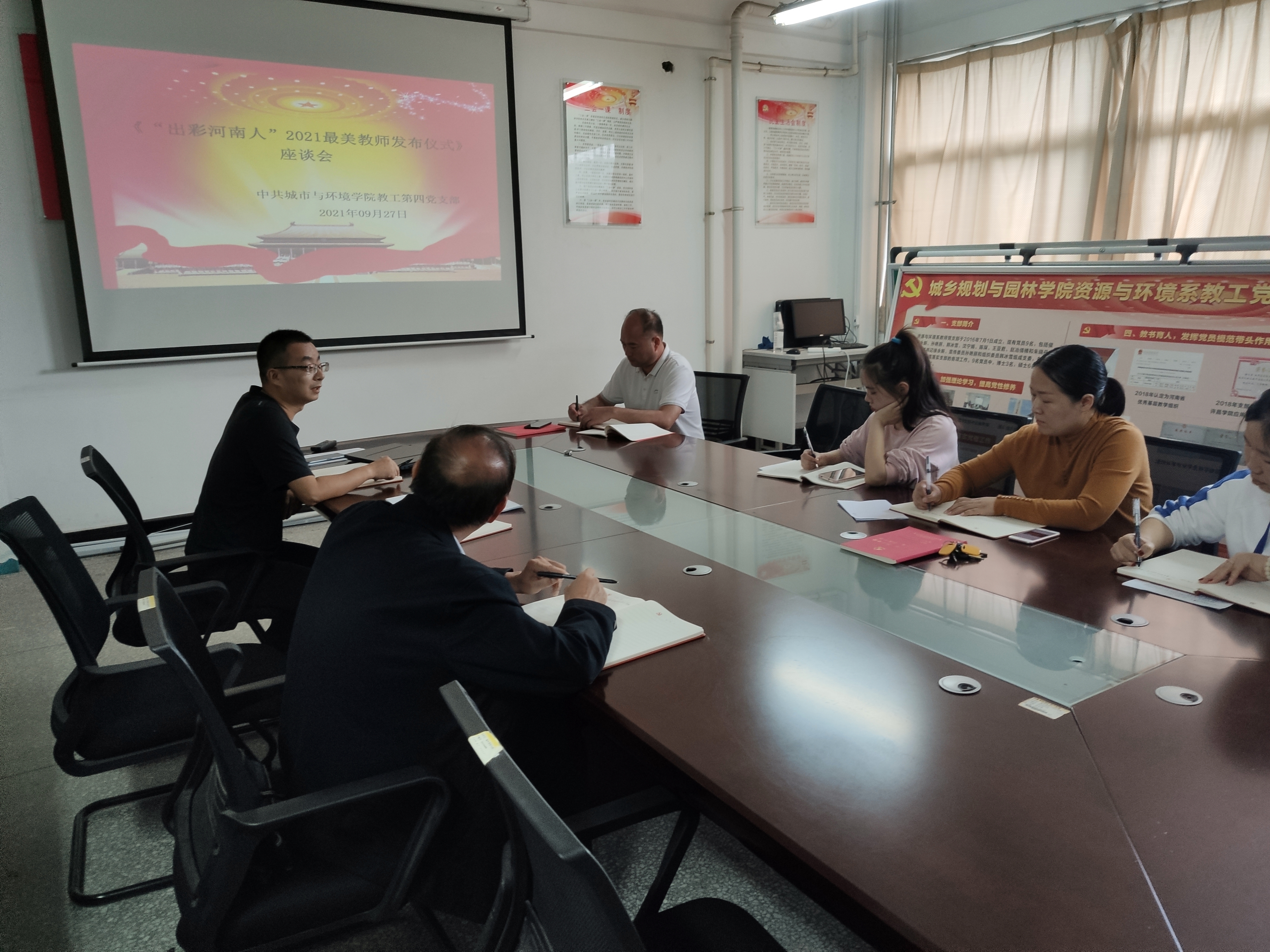 为了更好的深入学习优秀教师先进事迹,加强学习,提升自我,城市与环境学院教工第四党支部于2021年9月27日在党员活动室召开了观看《“出彩河南人”2021最美教师发布仪式》座谈会。