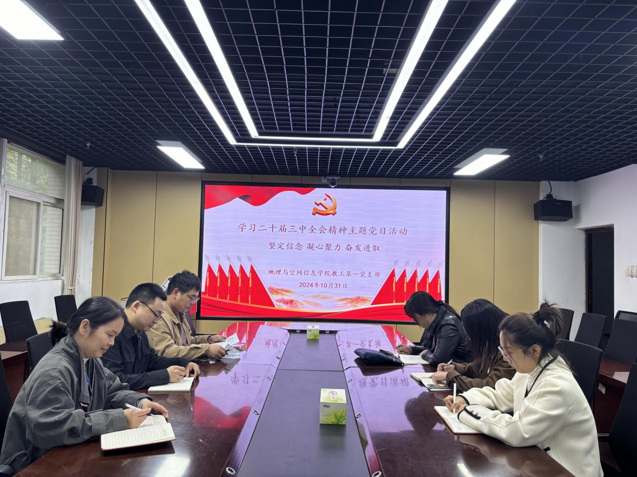 2024年10月31日下午3:30,地理与空间信息学院教工第一党支部在院二楼会议室,组织召开以“坚定信念、凝神聚力、奋发进取”为主题,学习党的二十届三中全会精神主题党日活动。会议由支部书记田光辉同志主持,党支部全体党员参会。