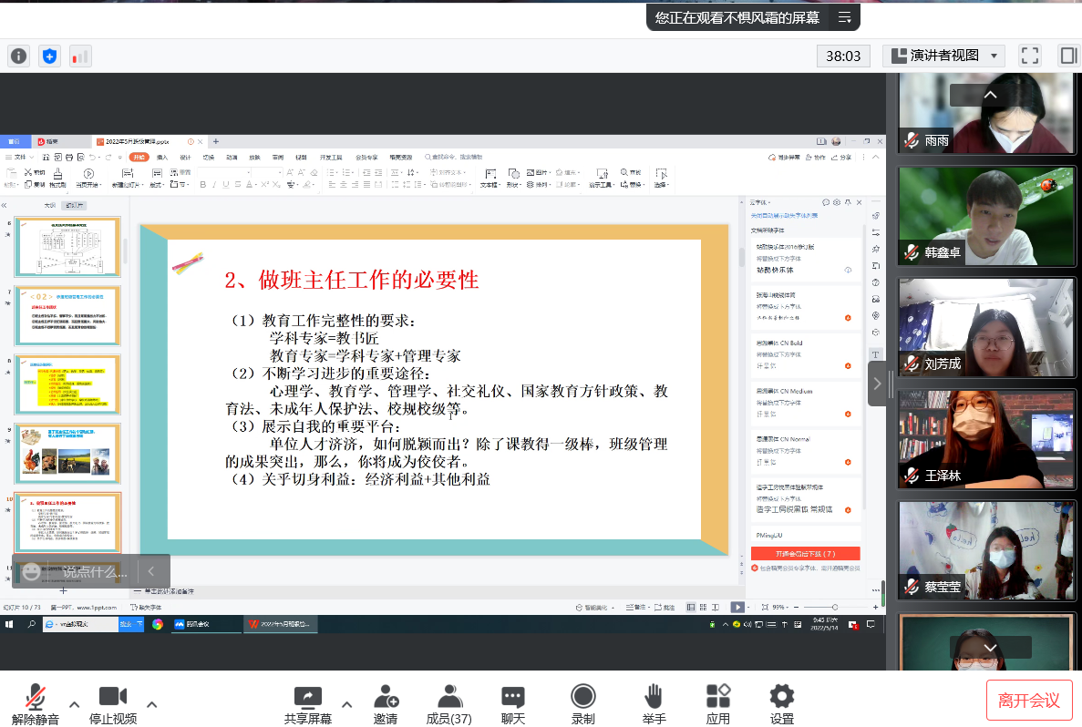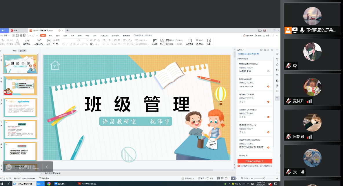 2022年5月14日上午,邀请许昌市教育局地理学科调研员祝泽宇老师以“班级管理的经验交流”为题为地理科学专业学生开展讲座。由于疫情原因,根据许昌学院的防疫要求,本次讲座采用的线上讲座的形式进行,但依旧阻挡不了同学们的学习热情。讲座开始,徐永新老师介绍了主讲教师祝泽宇老师的基本情况,为与会同学介绍了举办本次讲座的目的意义,并预祝了本次讲座圆满成功。