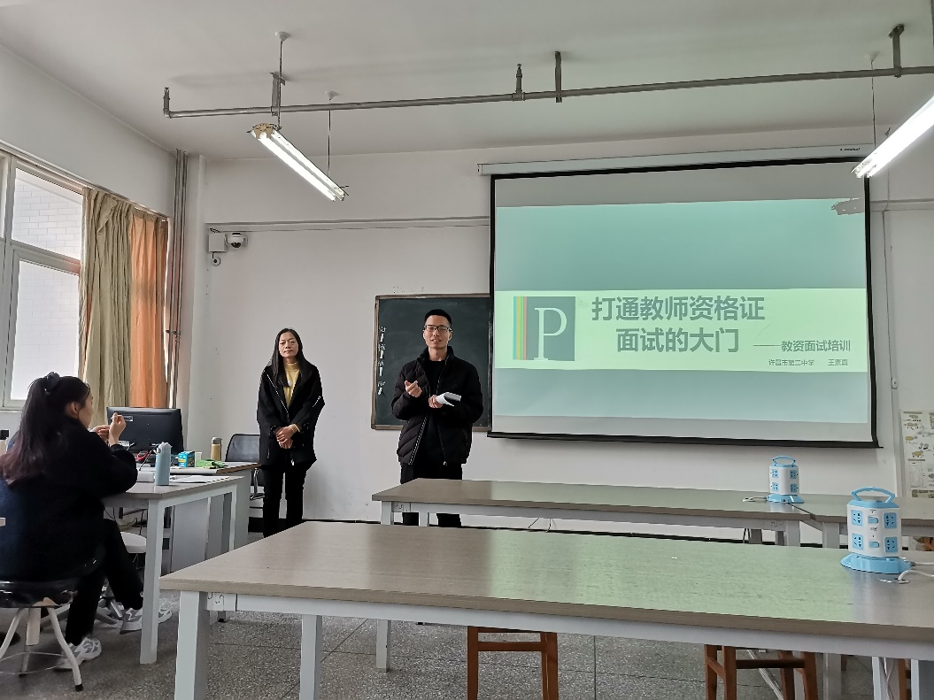 在答辩环节,王老师从党的思想政治方面、教育理论方面、教育管理方面讲解了面试过程当众可能会遇到的问题并且提出了指导方案,王老师强调:“只有掌握了理论知识,才能在面试中应对自如”。